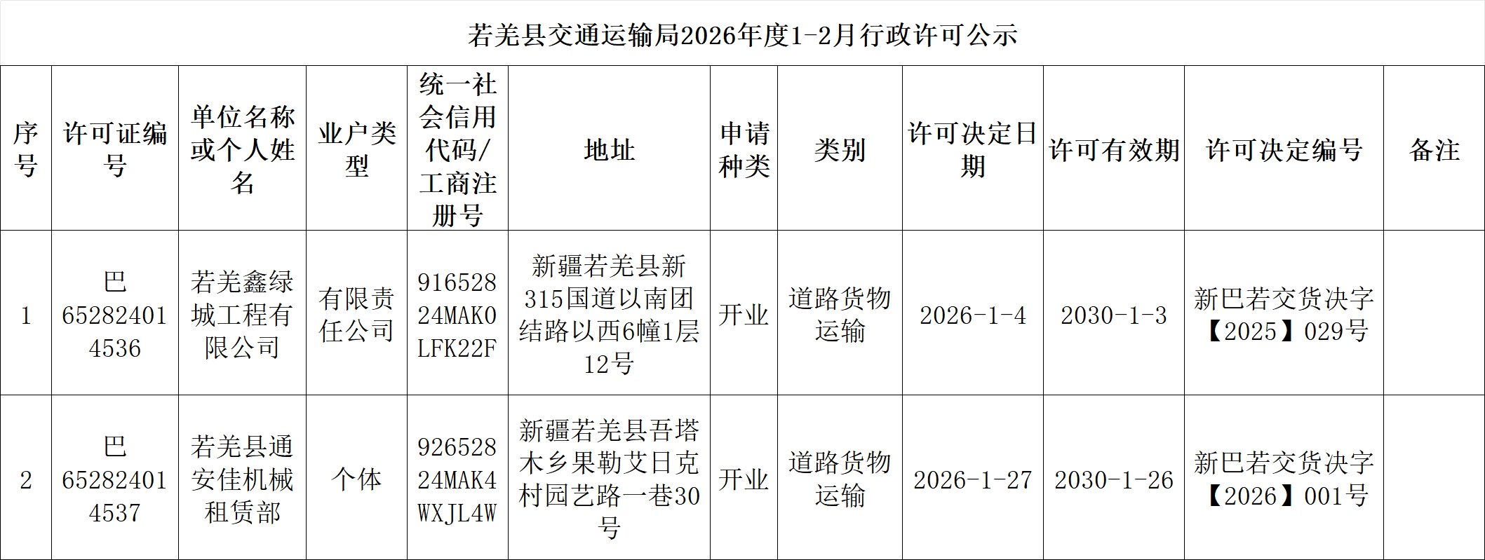 若羌县交通运输局2026年1-2月行政处罚、行政许可公示