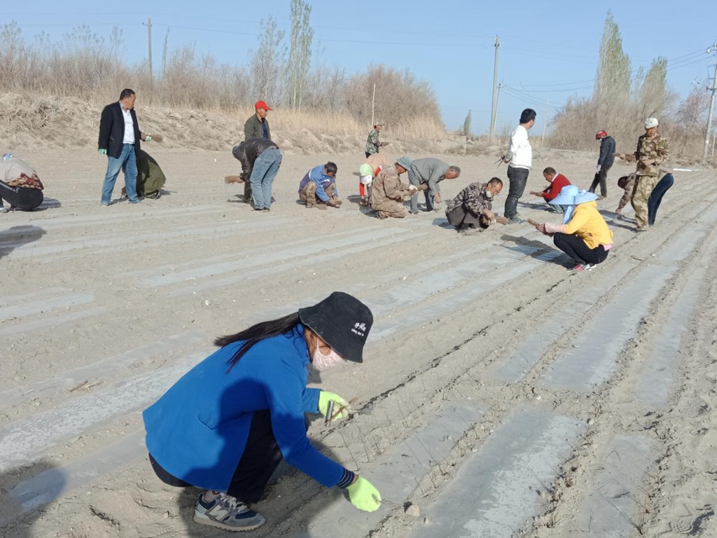 经四议两公开的方式一致取得党员、村民代表赞成和选址、选苗后,育苗基地于4月7日正式开工,全体党员干部、村两委、镇派工作队队员共计60余人参与到育苗工作中,经过3天辛勤的努力后,25万株小小的胡杨苗播种完成。