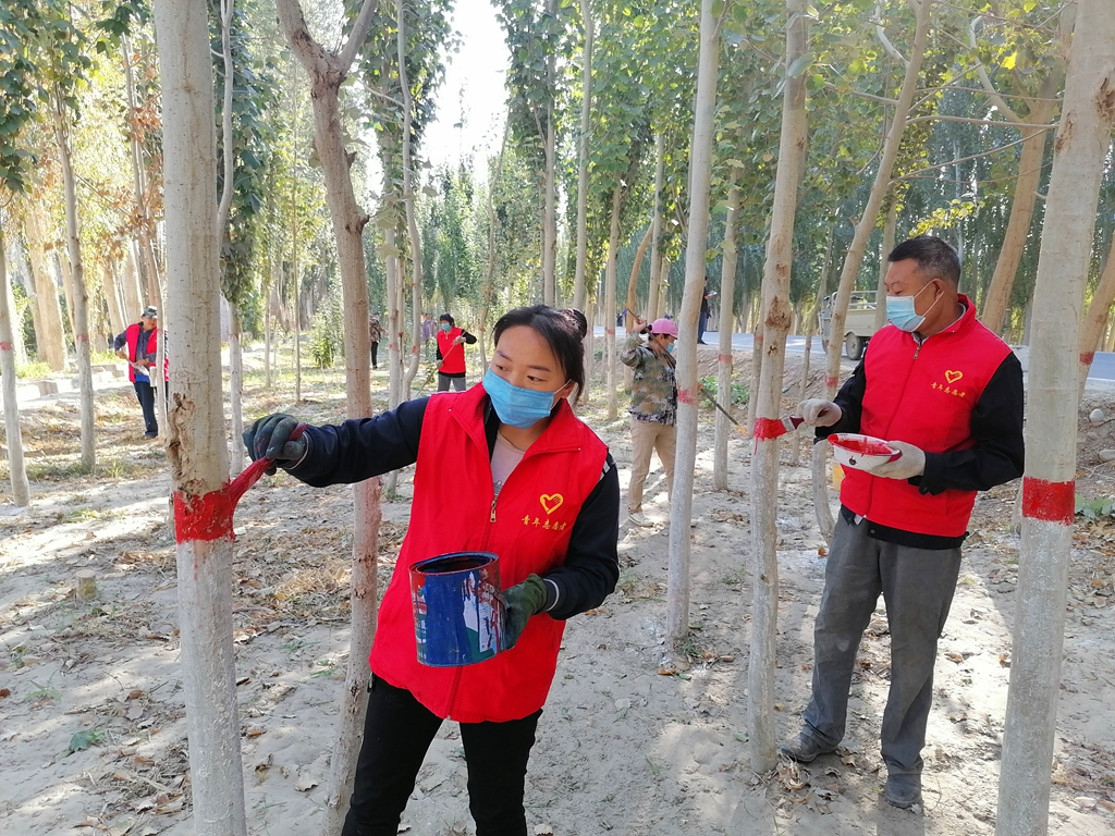 9月15日,在吾塔木乡尤勒滚艾日克村的主次干道、景观带、防护林等地都能看到志愿服务队在进行树木“涂白”养护工作,活动现场人头攒动、热闹非凡。
