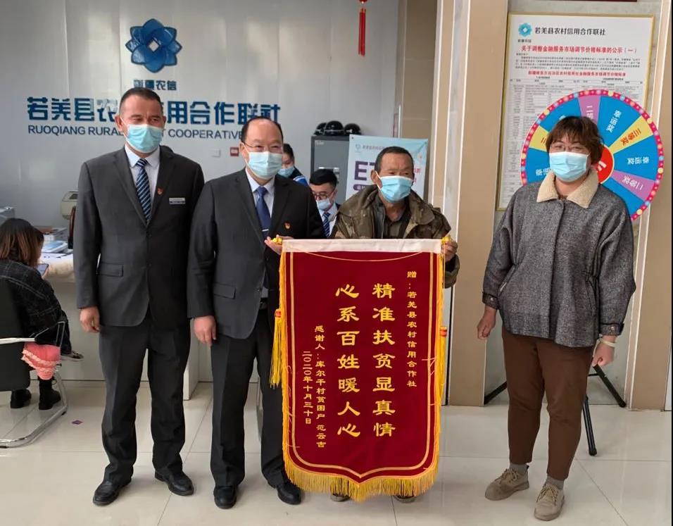 “感谢若羌县联社对贫困户的关心,感谢你们对我的用情帮扶。”近日,若羌县铁干里克镇访惠聚工作队队长、驻库尔干村第一书记吴春静、扶贫专干郭家煜、库尔干村建档立卡贫困户范云吉一行三人,将印有“精准扶贫显真情,心系百姓暖人心”的锦旗专程送到若羌县联社,衷心感谢若羌县联社对贫困户范云吉的真情帮扶。