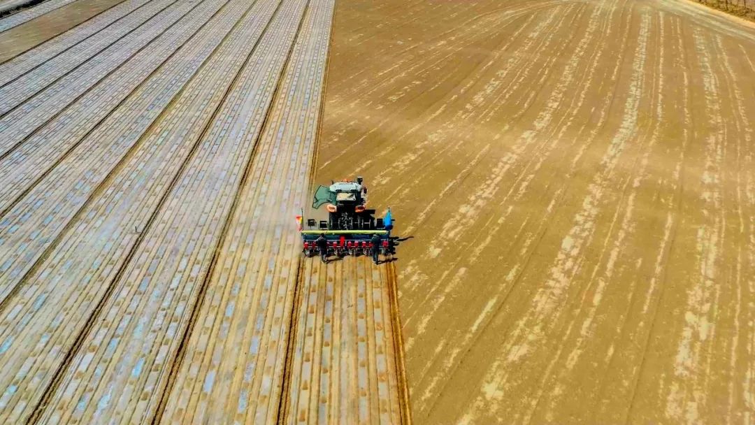 近日,在若羌县瓦石峡镇金胡杨流动人口管理站,棉花播种机正在地里来回穿梭,高效率作业,棉农们紧跟播种机查看开沟、下种、铺膜、覆土,开足马力播种棉花,确保“一播全苗”。