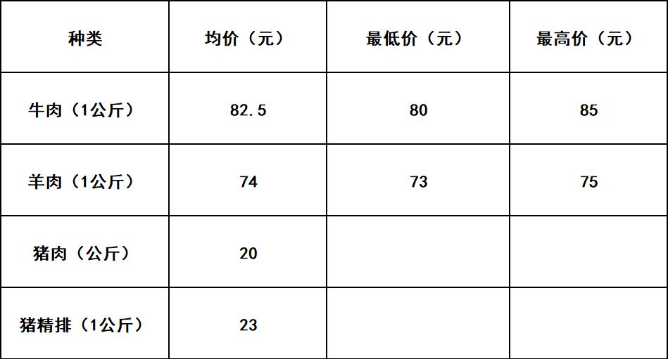 价格走向分析:与2月28日比对,米面油、蔬菜等价格平稳,平均价格涨跌幅度在±0.71元范围内;牛肉均价上涨5元(绿草原养殖专业合作社牛肉零售价80元),羊肉均价格上涨1.5,猪肉均价格下降3元,猪精排价下降5元。