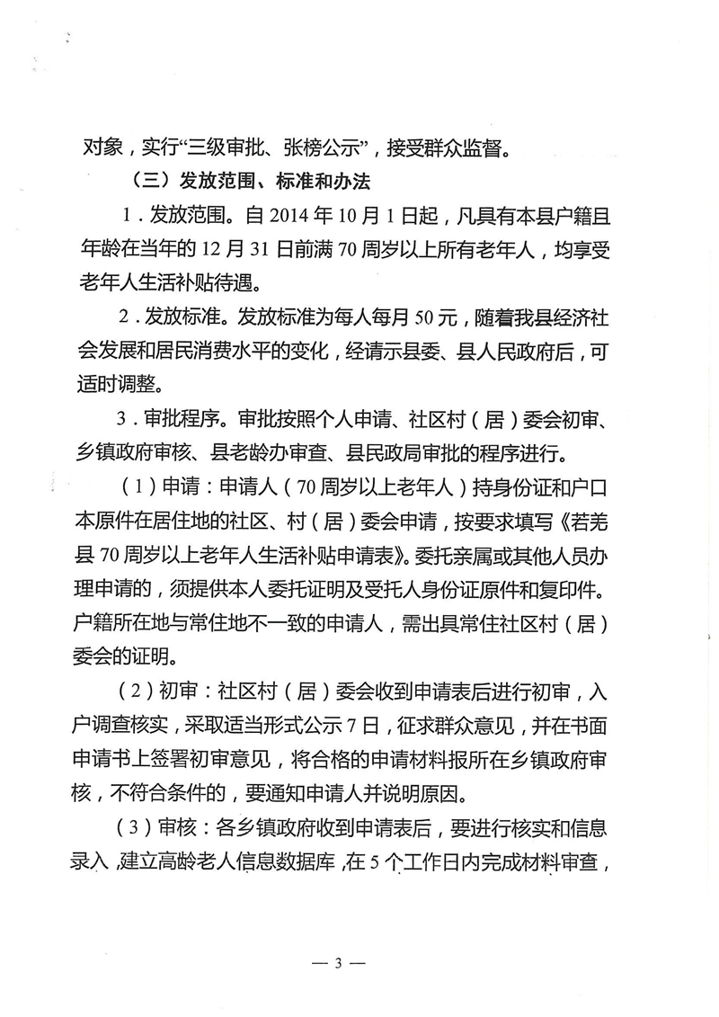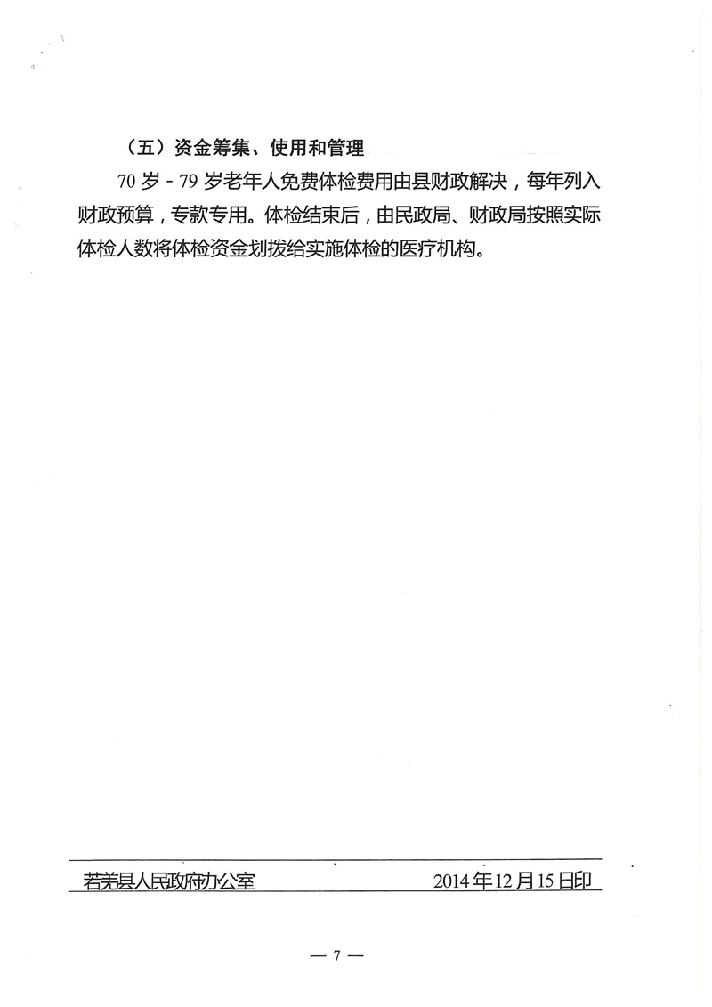 印发关于将若羌县70岁-79岁老人纳入老年人基本生活补贴发放制度和免费体检制度范围实施方案的通知(若政办发(2014)97号