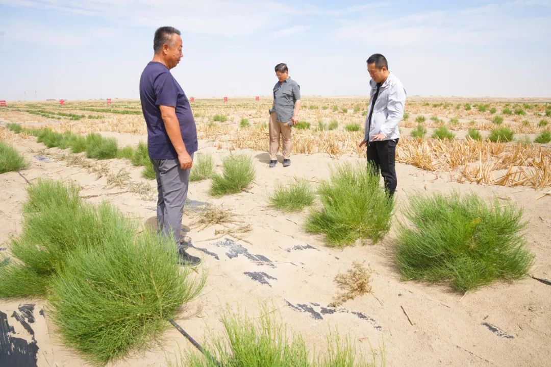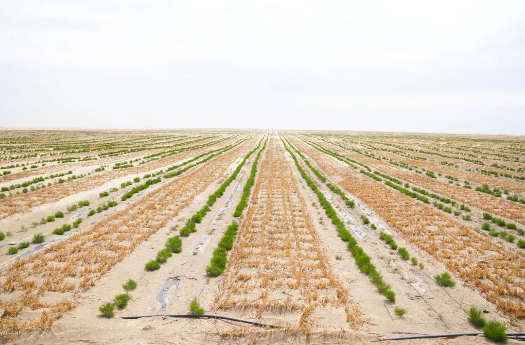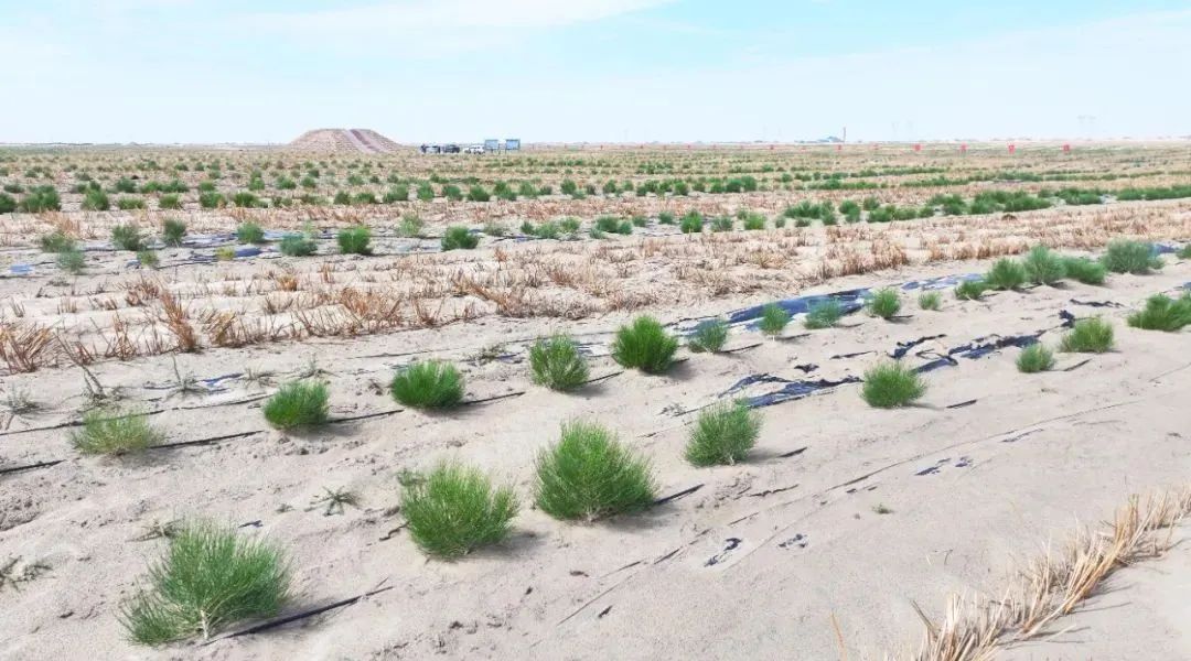 “我们通过草方格沙障、阻沙网等措施固定流动沙丘,降低地表风速,稳定沙面,为植物生长创造有利条件。然后栽种具有耐旱、抗风沙特性的梭梭苗木,再套种黑枸杞等经济作物,推动治沙与沙产业发展融合,实现生态与经济的双重效益。”张磊说道。