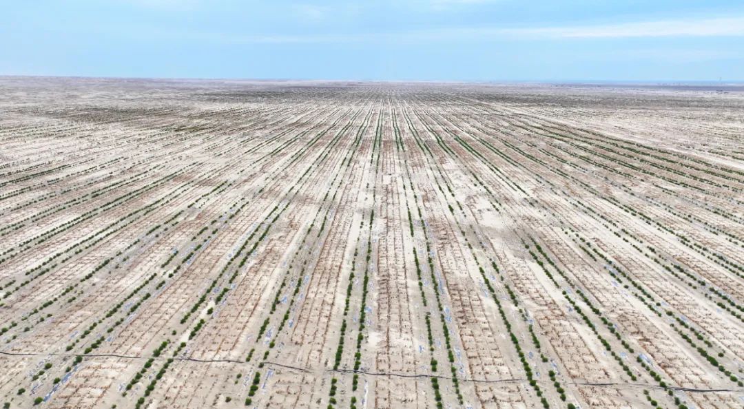 近日,若羌县塔克拉玛干沙漠边缘锁边工程国道218线一期项目现场,一片新绿正顽强地向黄沙深处延伸,给沙漠披上了一层“绿衣”。5200亩生物治沙区栽种的138万株梭梭苗长势葱郁,与周边的草方格沙障构成了立体治沙网,标志着若羌在荒漠化防治与生态修复方面取得了阶段性成效。