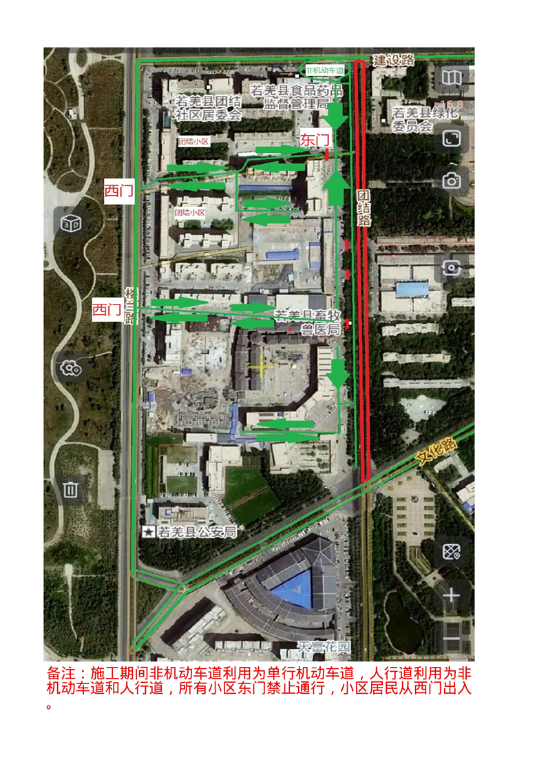 三、绕行路线:根据施工实际情况,沿线各居民小区及团结路方向车辆建议绕行路线如下(如图所示):