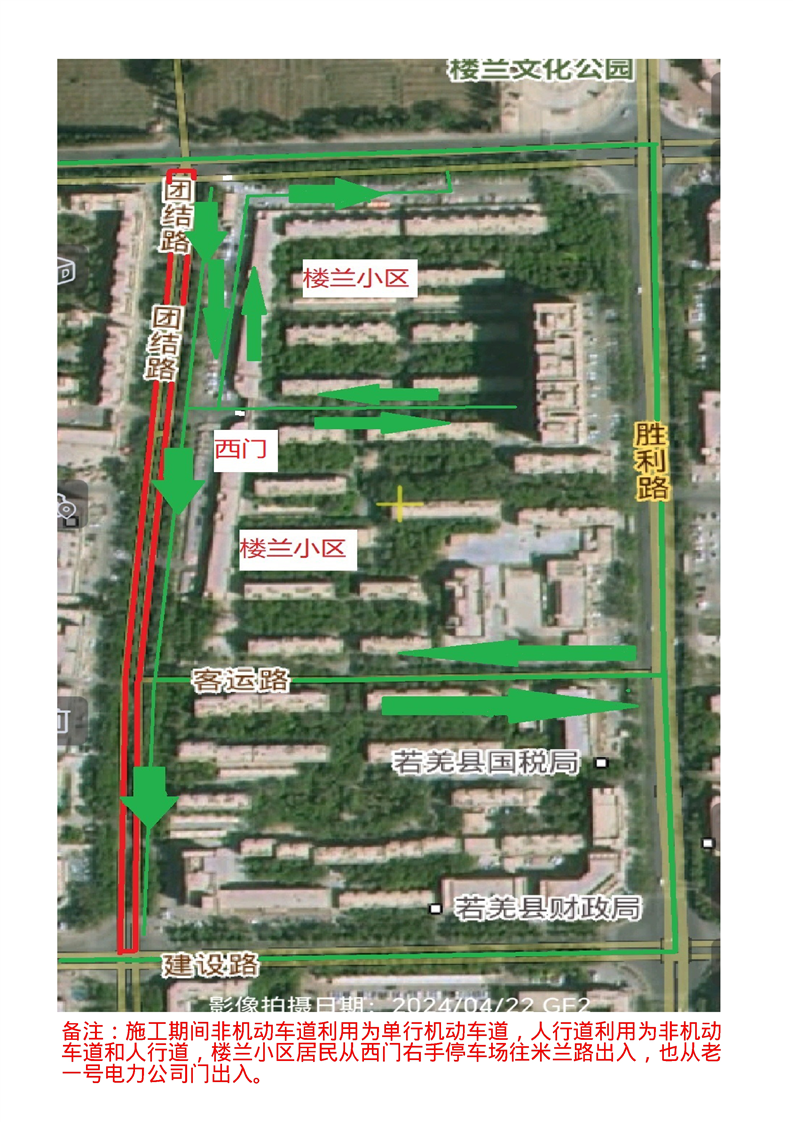 2、楼兰小区居民由门口右手停车场往米兰路出入或从客运路出入。