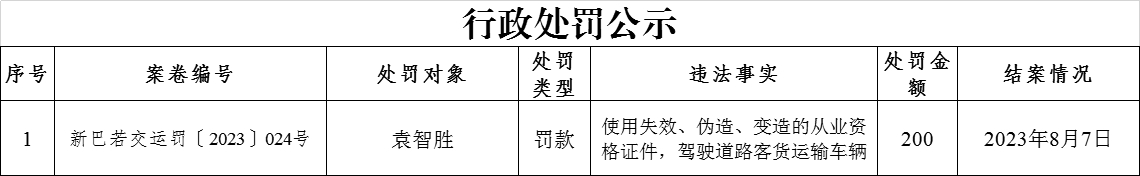 县交通运输局行政处罚公示(新巴若交运罚〔2023〕024号)