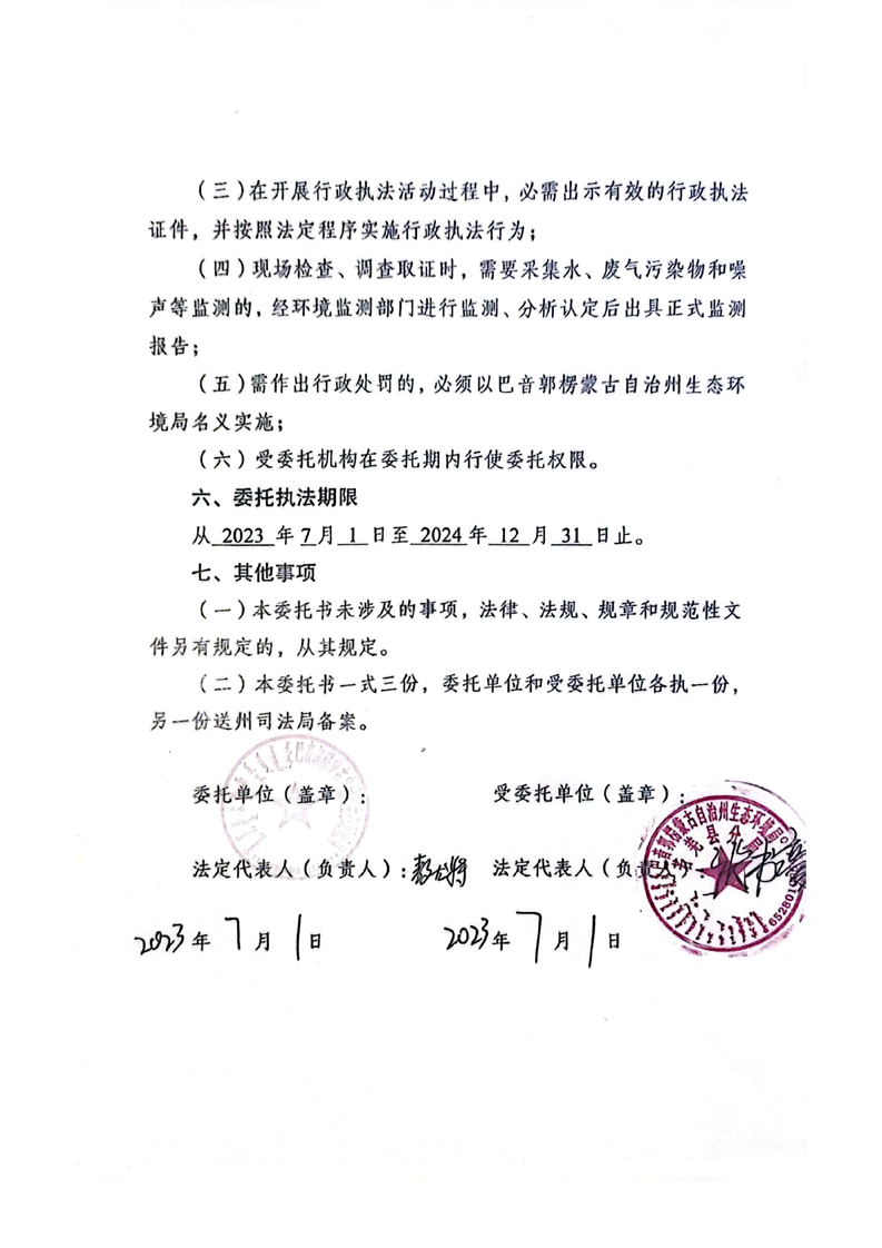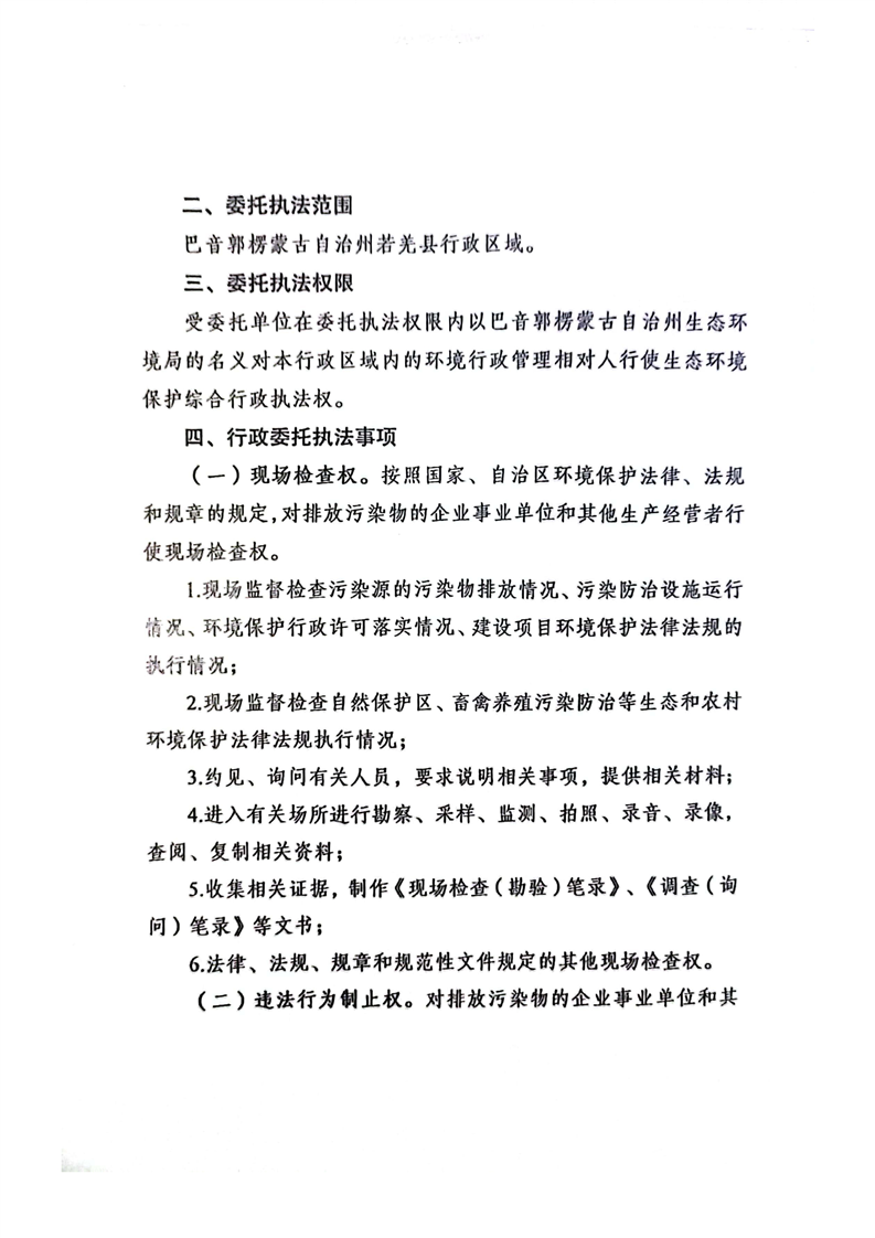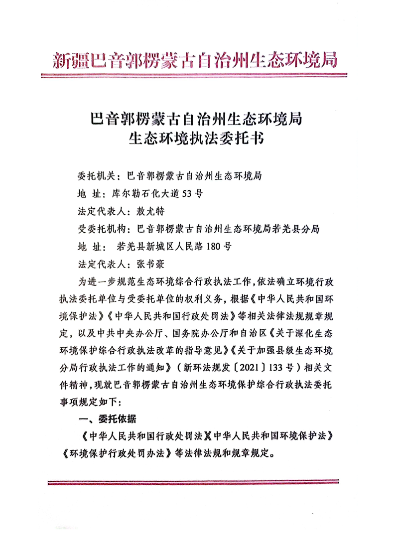 巴音郭楞蒙古自治州生态环境局生态环境执法委托书