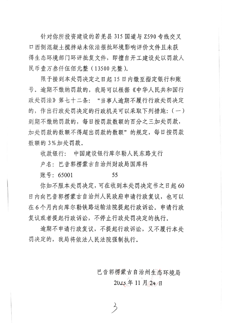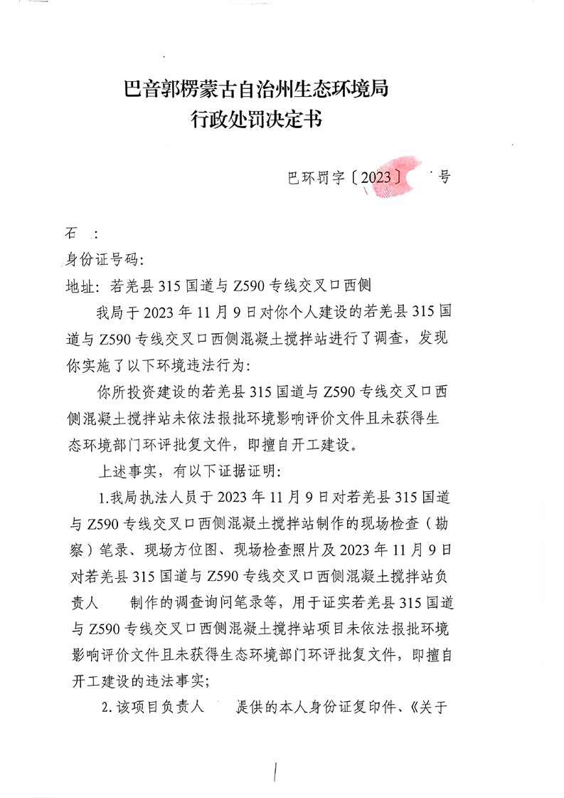 (石某违反环境影响评价制度案)《巴音郭楞蒙古自治州生态环境局行政处罚决定书》