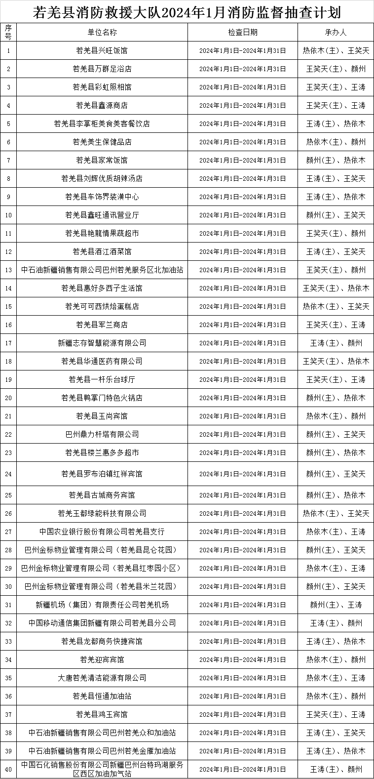 若羌县消防救援大队2024年1月消防监督抽查计划