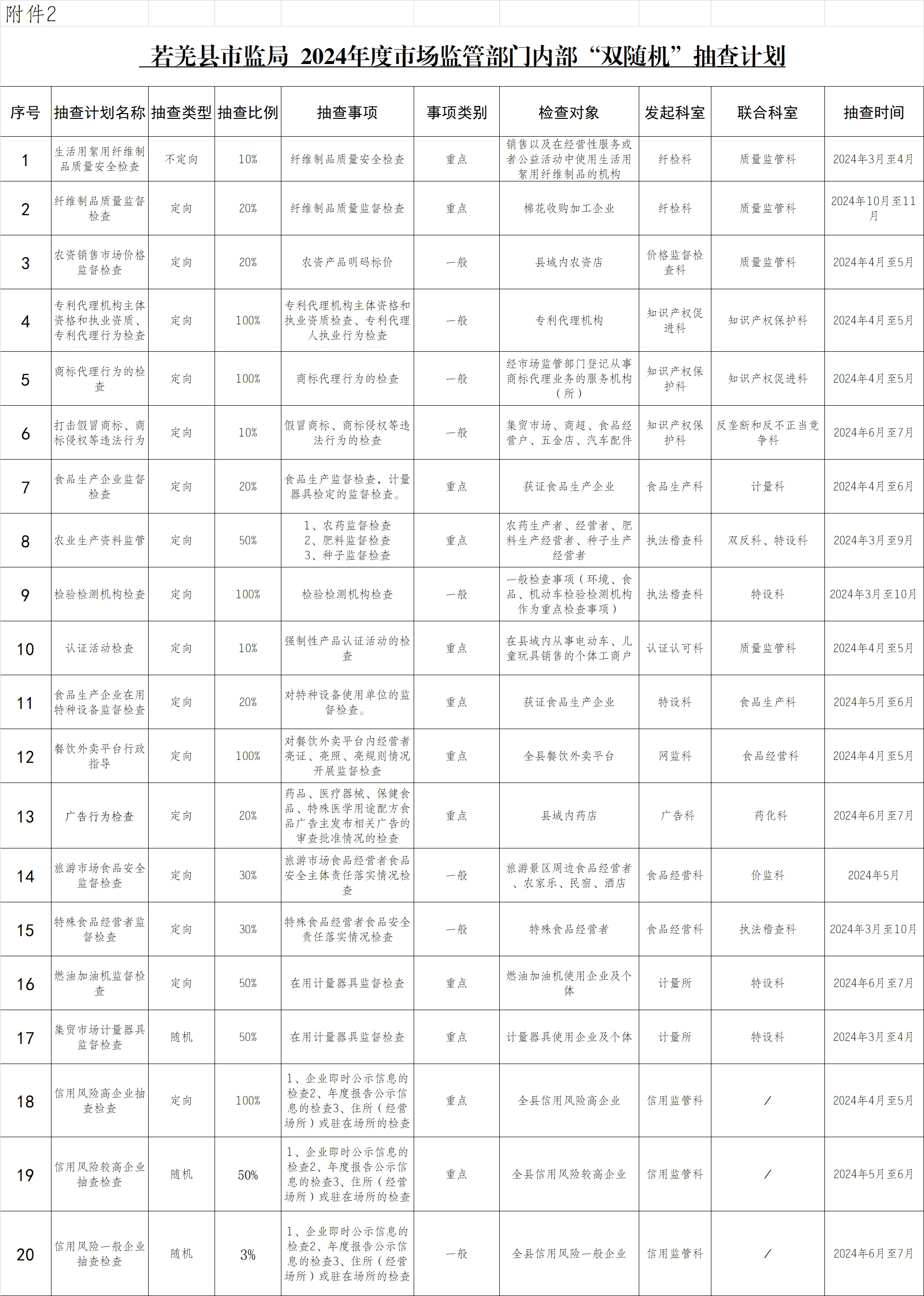 若羌县市监局2024年度市场监管部门内部“双随机”抽查计划