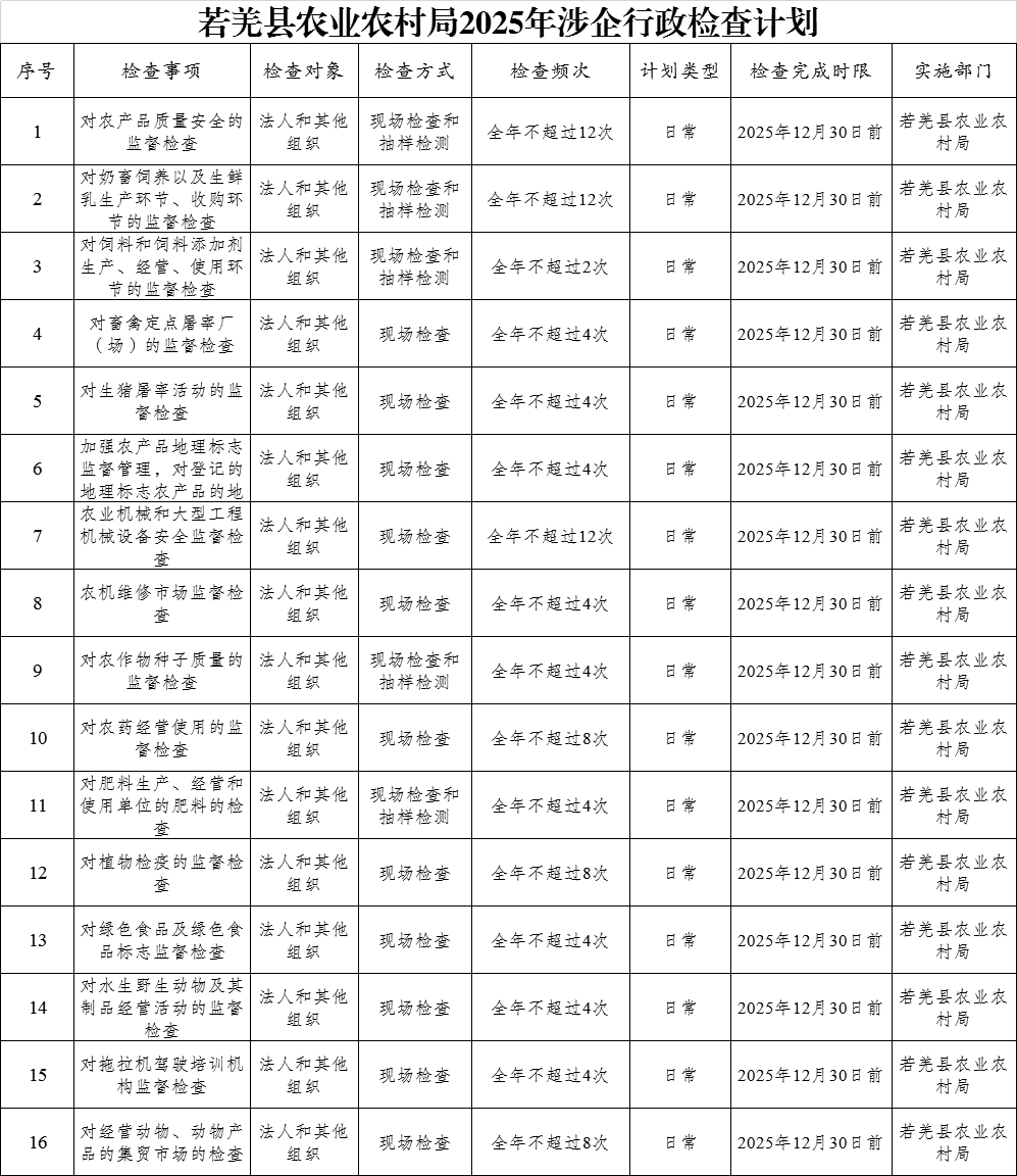 若羌县农业农村局2025年涉企行政检查计划