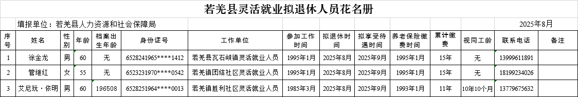 附件:若羌县2025年8月灵活就业人员拟退休花名册