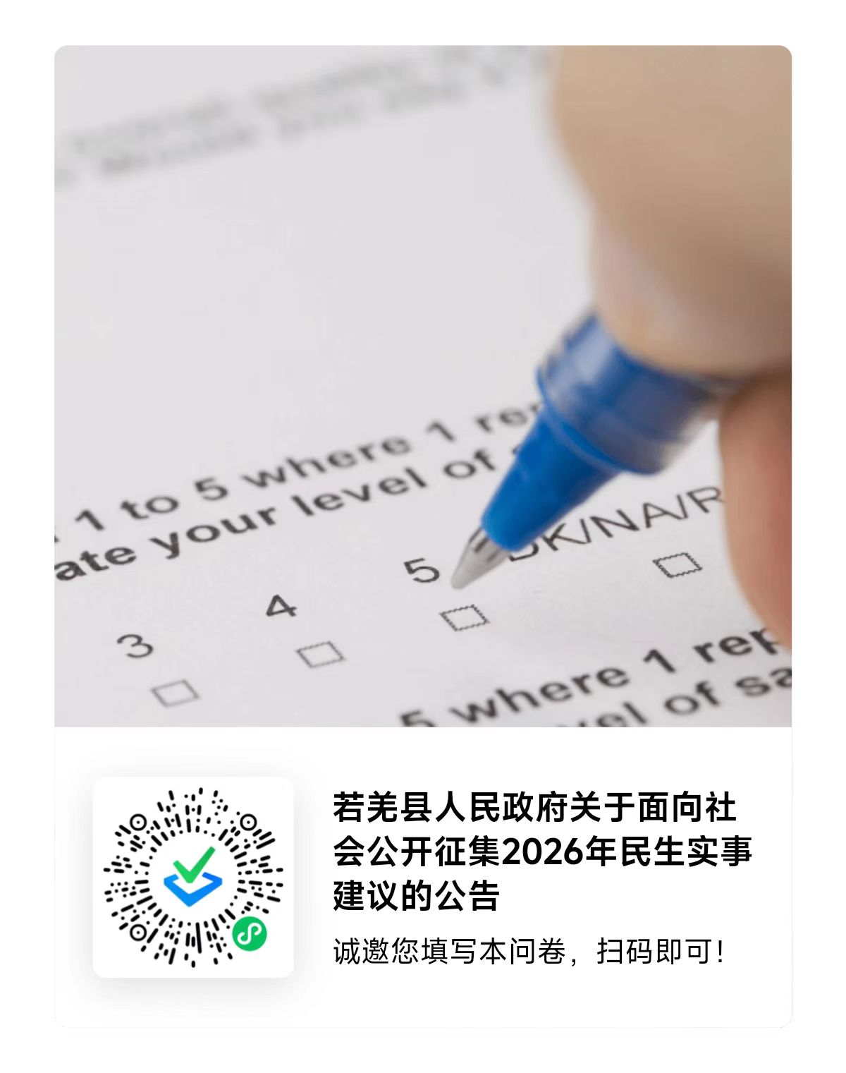 今年是“十四五”规划收官之年,也是“十五五”规划谋篇布局之年,为紧贴民生凝聚人心推动高质量发展,进一步增进民生福祉,若羌县人民政府决定面向全县人民和社会各界征集2026年若羌县民生实事建议。现就有关事项公告如下: