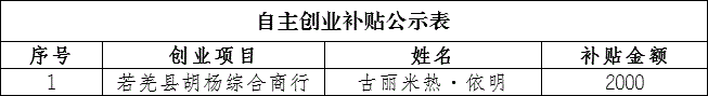 若羌镇1名自主人员申报创业补贴2000元,《根据维吾尔自治区就业资金管理暂行办法》(新财社[2018]241号)文件精神,若羌县人社局实地调查核实,符合享受自主创业补贴政策。现将人员名单进行公示。