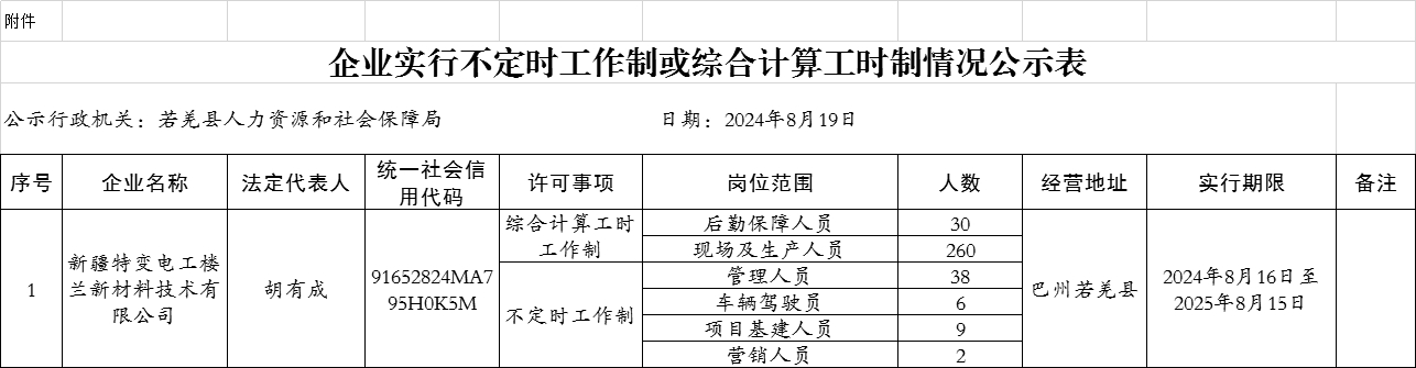 根据《中华人民共和国劳动法》第三十九条、《关于企业实行不定时工作制和综合计算工时工作制的审批办法》和《企业实行综合计算工时工作制和不定时工作制审批管理工作实行办法》(新人社发〔2009〕07号)有关规定,经审查同意新疆特变电工楼兰新材料技术有限公司实行不定时工作制或综合计算工时制,现予以公示。