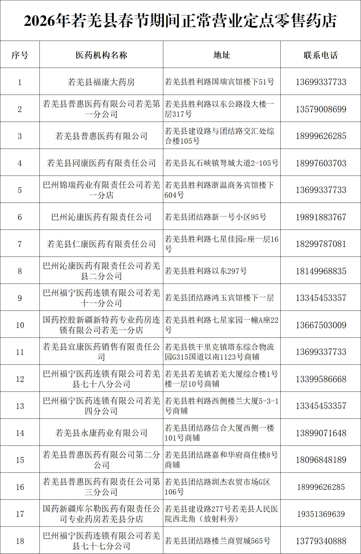 春节将至,为保障节日期间群众购药需求,现将春节期间正常营业的定点零售药店公布如下: