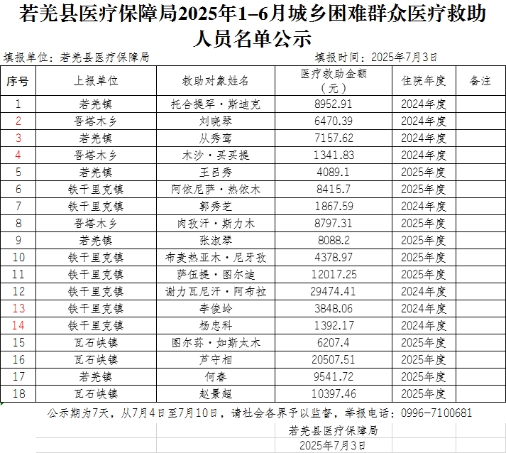 若羌县医疗保障局2025年1-6月城乡困难群众医疗救助人员名单公示