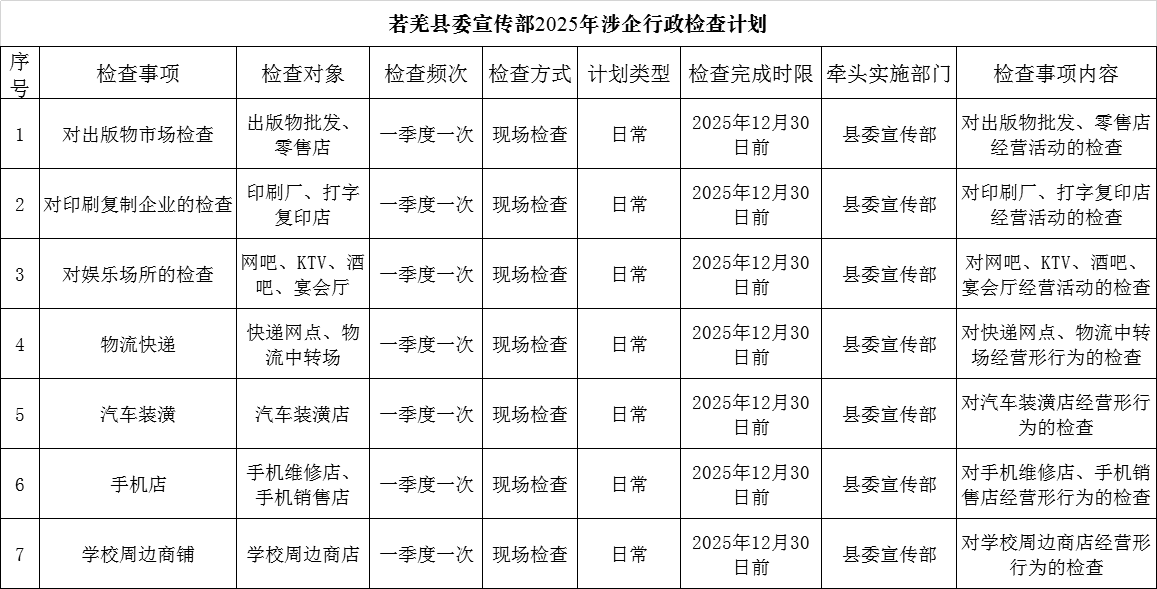若羌县委宣传部2025年涉企行政检查计划